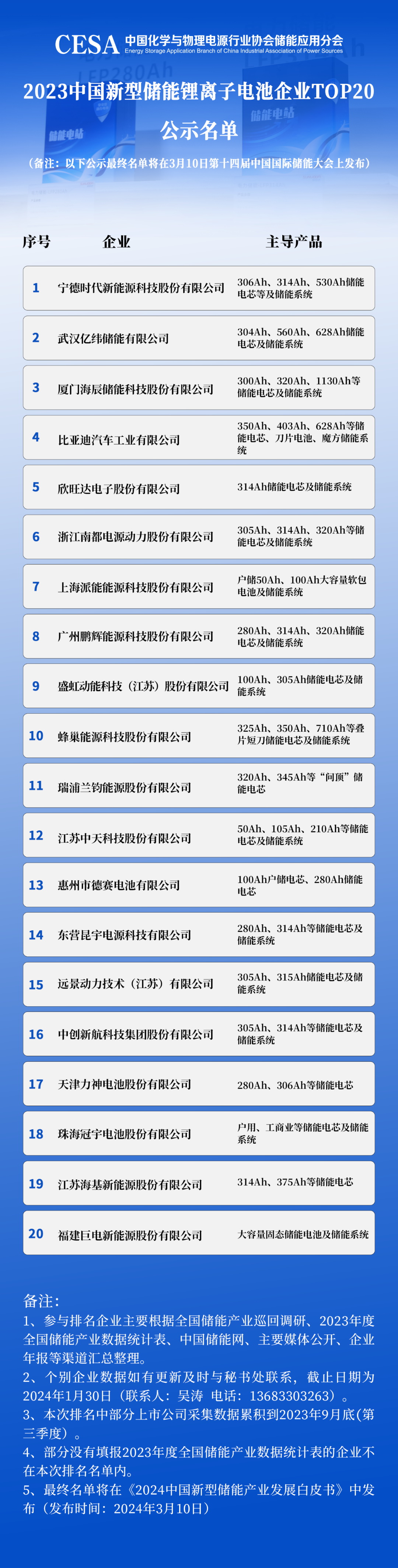 本次儲(chǔ)能產(chǎn)業(yè)鏈百?gòu)?qiáng)企業(yè)評(píng)選活動(dòng)針對(duì)的對(duì)象主要是 CESA 儲(chǔ)能應(yīng)用分會(huì)廣大會(huì)員企業(yè)和與儲(chǔ)能業(yè)務(wù)緊密相關(guān)的上市公司,評(píng)價(jià)數(shù)據(jù)以2023年為準(zhǔn),主要通過(guò)協(xié)會(huì)實(shí)地走訪調(diào)研、會(huì)員企業(yè)年度數(shù)據(jù)申報(bào)、媒體披露和上市公司年報(bào)等多個(gè)渠道,最終形成2023中國(guó)新型儲(chǔ)能鋰離子電池企業(yè)TOP20、2023中國(guó)新型儲(chǔ)能系統(tǒng)集成企業(yè)TOP30、2023中國(guó)新型儲(chǔ)能PCS企業(yè)TOP30、2023中國(guó)新型儲(chǔ)能液流電池企業(yè)TOP30、2023中國(guó)工商業(yè)儲(chǔ)能企業(yè)TOP60、2023中國(guó)新型儲(chǔ)能BMS企業(yè)TOP10、2023中國(guó)新型儲(chǔ)能飛輪儲(chǔ)能企業(yè)TOP10、2023中國(guó)新型儲(chǔ)能溫控系統(tǒng)企業(yè)TOP20、2023中國(guó)新型儲(chǔ)能消防與安全企業(yè)TOP 20、2023中國(guó)新型儲(chǔ)能壓縮空氣儲(chǔ)能企業(yè)TOP10及2023中國(guó)新型儲(chǔ)能產(chǎn)業(yè)企業(yè)TOP100名單。
