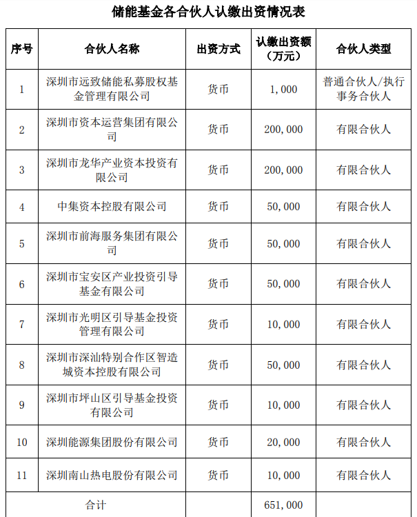 根據(jù)公告顯示,深圳南山熱電股份有限公司作為有限合伙人以自有資金1億元投資深圳市新型儲能產(chǎn)業(yè)股權(quán)基金合伙企業(yè)(有限合伙),該儲能基金總獲65.1億出資。