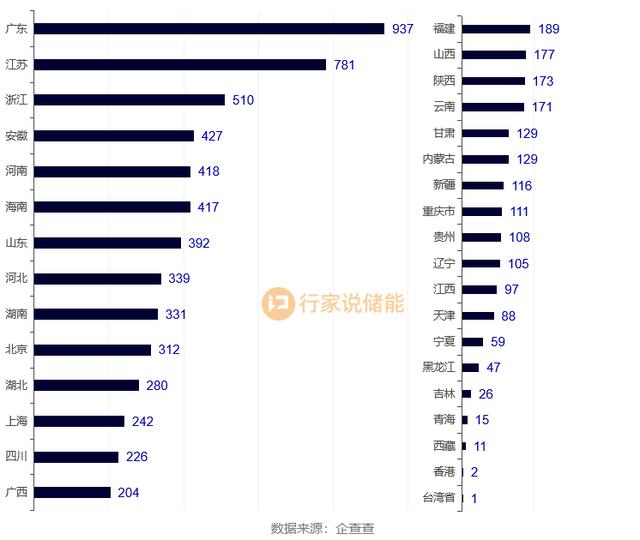 分區(qū)域來(lái)看,新增儲(chǔ)能企業(yè)主要分布在廣東、江蘇、浙江等地。