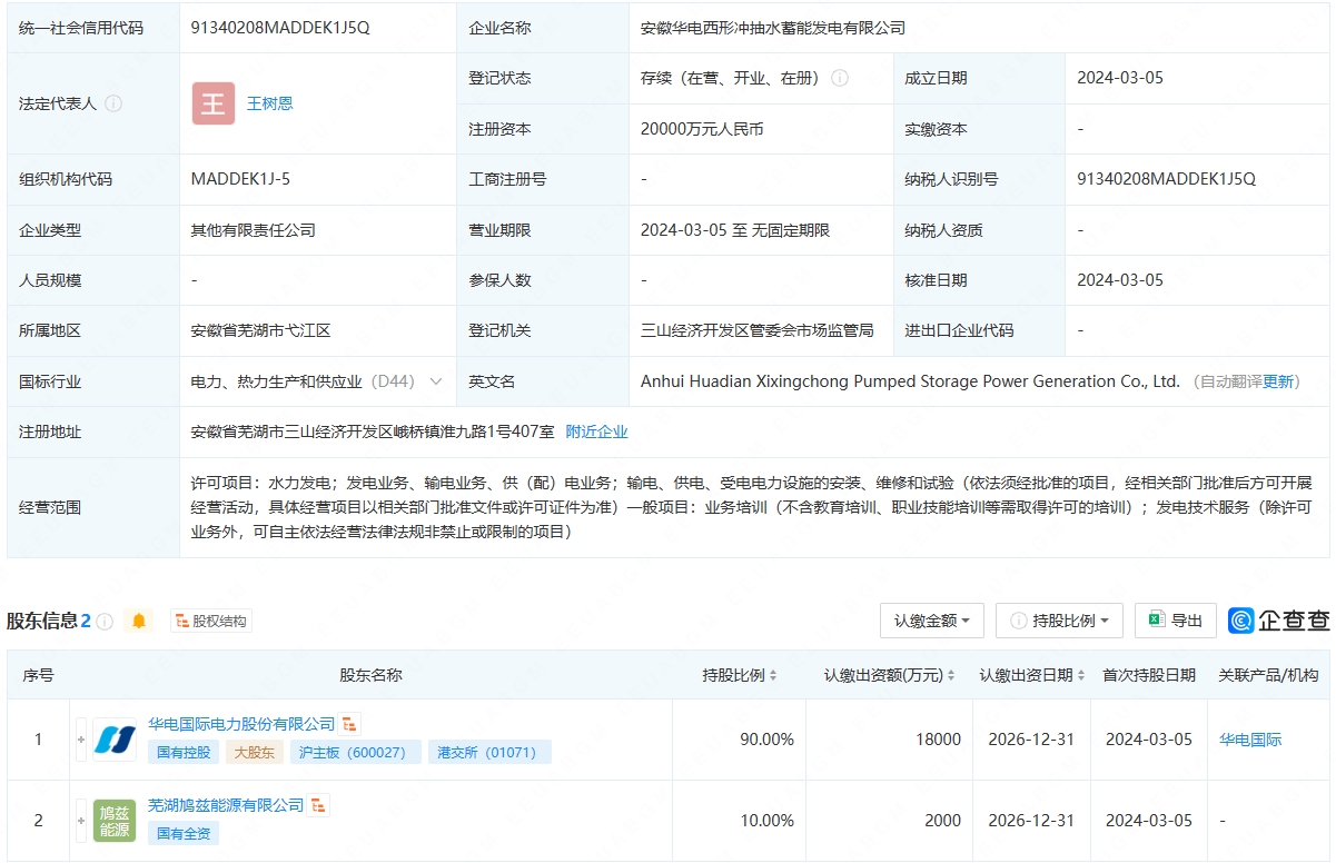 近日,安徽華電西形沖抽水蓄能發(fā)電有限公司成立,法定代表人為王樹恩,注冊資本為2億元,經營范圍包含:水力發(fā)電;發(fā)電業(yè)務、輸電業(yè)務、供(配)電業(yè)務;業(yè)務培訓;發(fā)電技術服務等。