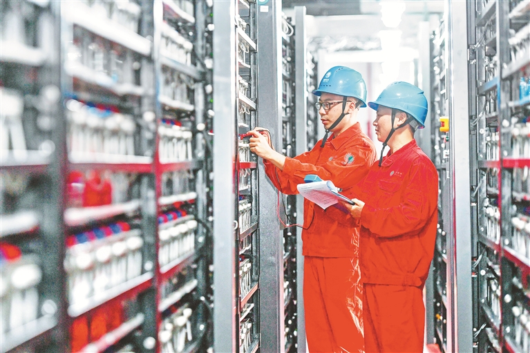 國家電網(wǎng)浙江省湖州市長興縣供電公司的工作人員正在蓄電池室檢測并網(wǎng)后單個(gè)蓄電池的電壓。圖片來源:視覺中國
