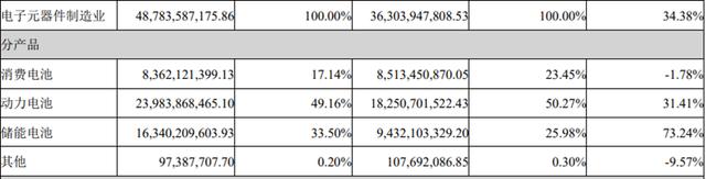 由于多數(shù)訂單為長期合同,儲能電池業(yè)務(wù)受價格戰(zhàn)影響較小,營業(yè)收入達到163.4億元,同比增長73.24%,占總營收的33.5%,毛利率也提升了8.07個百分點至17.03%。