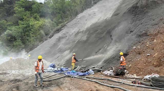 現(xiàn)場工人正在進行修筑邊坡。李蔓毓 攝