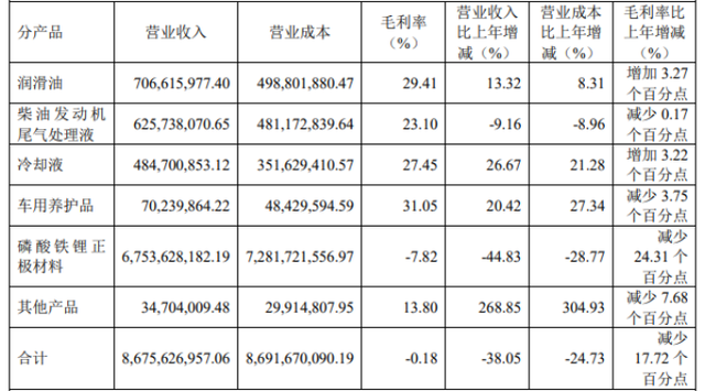 從產(chǎn)品端來看,龍蟠科技的潤滑油、冷卻液、車用養(yǎng)護(hù)品均實現(xiàn)了正向增長,對應(yīng)的營收分別為7.07億元、4.85億元、7023.99萬元,增速分別為13.32%、26.67%、20.42%。