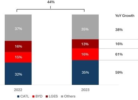 2023年全球電動(dòng)汽車電池裝機(jī)容量同比增長(zhǎng)44%,寧德時(shí)代和比亞迪作為中國(guó)電池制造商的代表,拿下了超過三分之二的市場(chǎng)份額,其中寧德時(shí)代是最大的受益者。