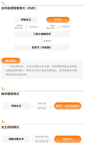 開發(fā)模式也更加清晰。工商業(yè)儲能項目開發(fā)模式有3種:合同能源管理模式(EMC)、融資租賃模式、業(yè)主自投模式。