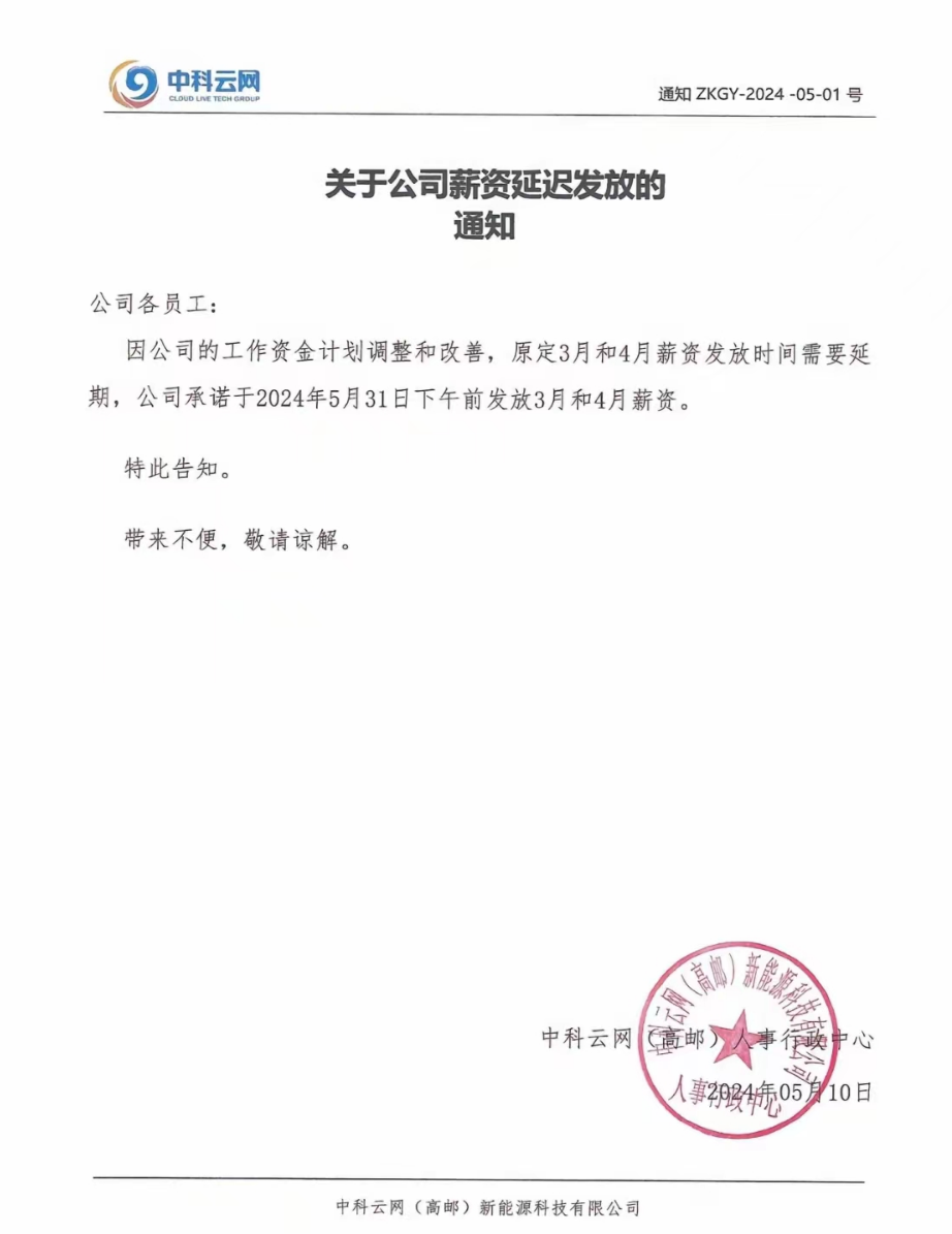 證券時(shí)報(bào)·e公司記者注意到,近日,有網(wǎng)友通過(guò)社交平臺(tái)發(fā)布了中科云網(wǎng)(高郵)新能源科技有限公司(下稱“中科高郵”)拖欠員工工資并放假的消息。