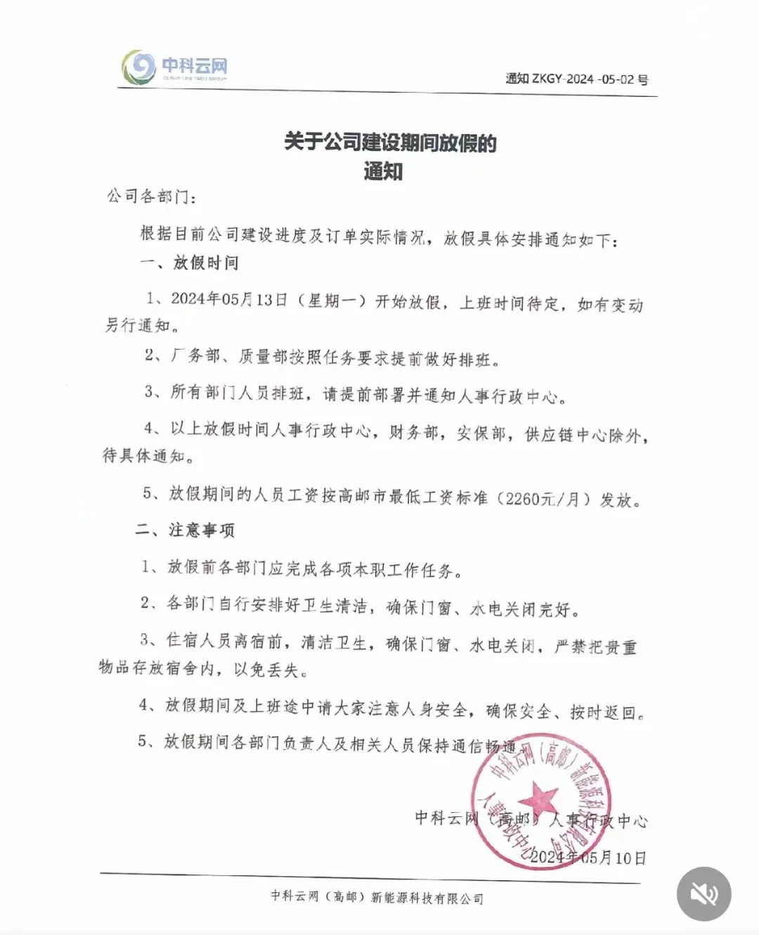 《放假通知》則指出,根據(jù)公司的建設(shè)進(jìn)度及訂單實(shí)際情況,除了人事行政中心、財(cái)務(wù)部、安保部和供應(yīng)鏈中心外,公司于5月13日開(kāi)始放假,上班時(shí)間待定。放假期間的人員工資按照高郵市最低工資標(biāo)準(zhǔn)(2260元/ 月)發(fā)放。
