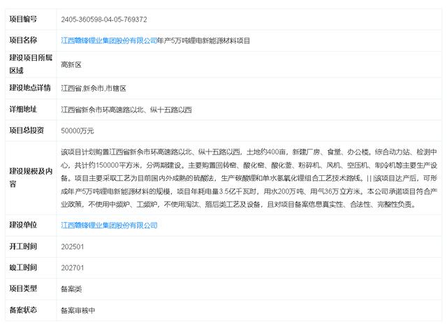 該項(xiàng)目編號(hào)為2405-360598-04-05-769372,項(xiàng)目名稱(chēng)為“江西贛鋒鋰業(yè)集團(tuán)股份有限公司年產(chǎn)5萬(wàn)噸鋰電新能源材料項(xiàng)目”。贛鋒鋰業(yè)作為建設(shè)單位,此次項(xiàng)目的開(kāi)工時(shí)間定于2025年1月,預(yù)計(jì)竣工時(shí)間為2027年1月,項(xiàng)目類(lèi)型為備案類(lèi),目前備案狀態(tài)為備案審核中。