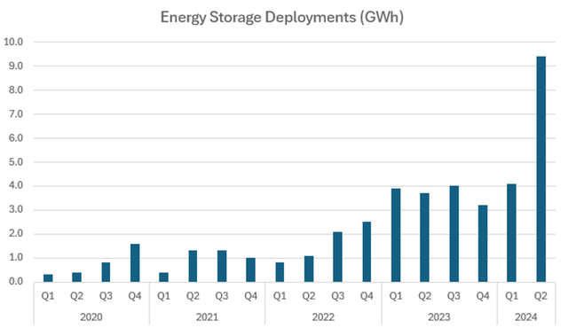 根據(jù)最新公布的數(shù)據(jù),第二季度,該公司儲能產(chǎn)品部署量升至9.4GWh,創(chuàng)下了公司紀錄,是其之前最大季度部署量的兩倍多,同比增長157%。