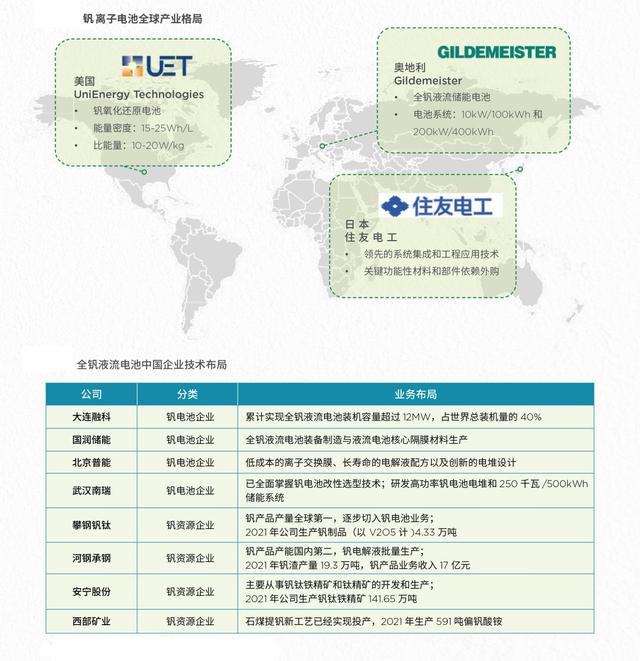 2022 年全釩液流電池整個(gè)行業(yè)還處于商業(yè)化進(jìn)程緩慢階段,全球范圍內(nèi)只有日本住友電工、美國(guó) UniEnergyTechnologies、奧地利 Gildemeister 和中國(guó)大連融科能提供成熟的商業(yè)化產(chǎn)品。2023年,隨著我國(guó)在長(zhǎng)時(shí)儲(chǔ)能、價(jià)格補(bǔ)償、鼓勵(lì)釩資源開(kāi)發(fā)等支持政策的落地生效以及資本市場(chǎng)的追捧,全釩液流電池賽道創(chuàng)新企業(yè)涌現(xiàn),推動(dòng)我國(guó)全釩液流儲(chǔ)能技術(shù)和產(chǎn)業(yè)發(fā)展向世界領(lǐng)先水平邁進(jìn)。