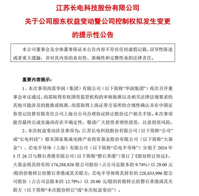 3月26日晚間,長電科技(SH600584,股價28.25元,市值505.3億元)發(fā)布公告稱,公司股東國家集成電路產(chǎn)業(yè)投資基金股份有限公司(以下簡稱“大基金”)、芯電半導(dǎo)體(上海)有限公司(以下簡稱“芯電半導(dǎo)體”)分別與磐石香港有限公司(以下簡稱“磐石香港”)簽訂《股份轉(zhuǎn)讓協(xié)議》,大基金及芯電半導(dǎo)體均以29元/股價格將合計(jì)所持22.53%公司股份轉(zhuǎn)讓給磐石香港或其關(guān)聯(lián)方;完成后公司控股股東將變更為磐石香港或其關(guān)聯(lián)方,實(shí)控人將變更為中國華潤,公司股票復(fù)牌。