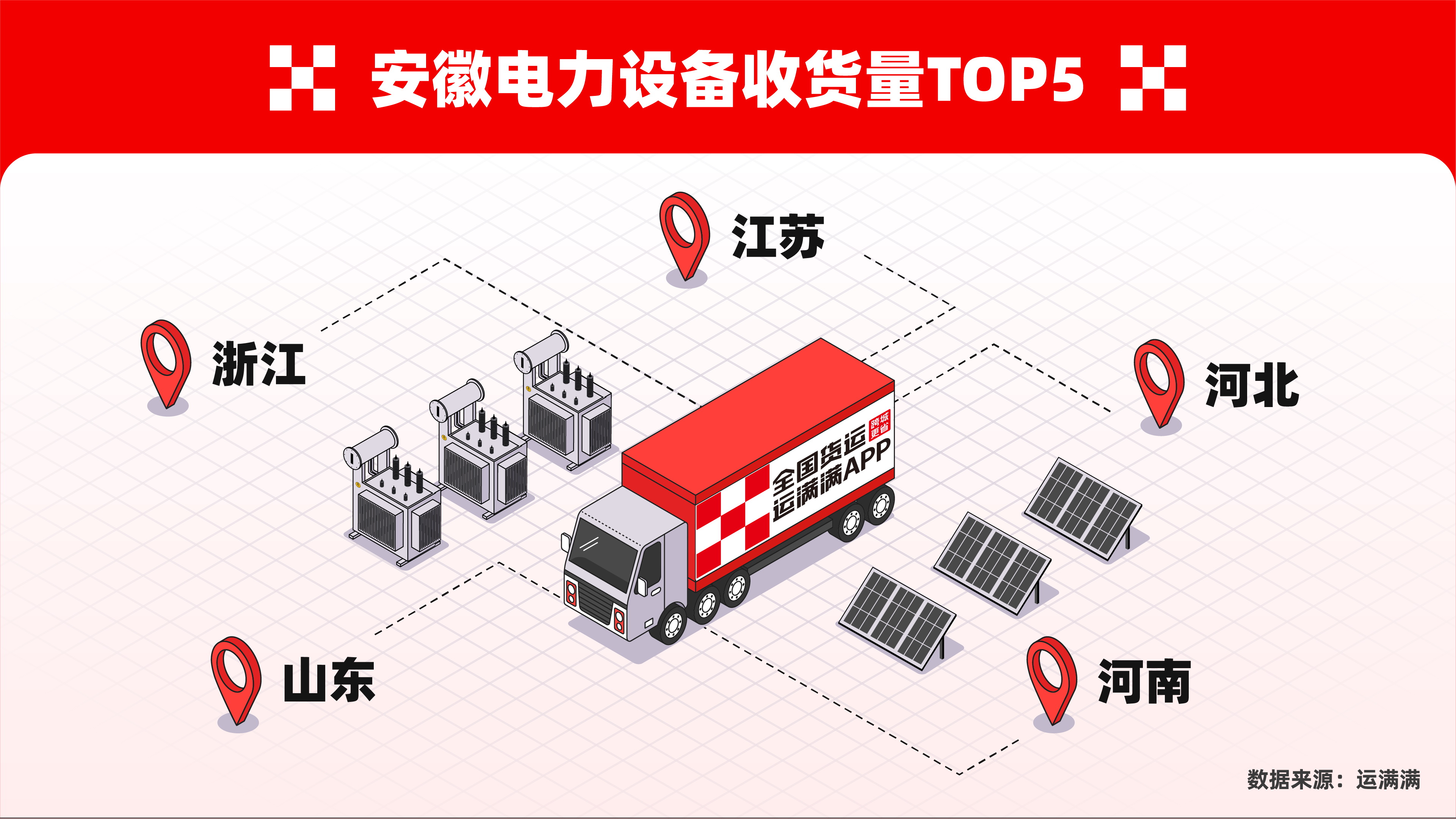2024 年,安徽電力設(shè)備在全國(guó)市場(chǎng)上表現(xiàn)亮眼。運(yùn)滿(mǎn)滿(mǎn)平臺(tái)數(shù)據(jù)顯示,這一年安徽電力設(shè)備發(fā)貨量在全國(guó)排名第7,省內(nèi)發(fā)貨量居前列的城市有合肥、滁州、蕪湖、宣城、阜陽(yáng)。從收貨地來(lái)看,依托長(zhǎng)三角一體化戰(zhàn)略,安徽電力設(shè)備主要銷(xiāo)往華東及華中地區(qū),其中江蘇、浙江、山東、河南、河北是2024年收貨量最多的省份,上海、梧州、南京、杭州、無(wú)錫則是收貨量最多的5個(gè)城市。