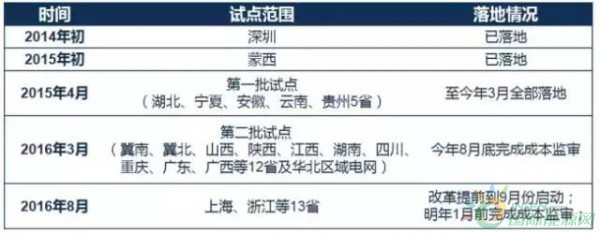原定2017年開展的14個省級電網(wǎng)輸配電價改革提前至2016年9月啟動,基本實(shí)現(xiàn)省級電網(wǎng)的全覆蓋;計劃于2017年1月底完成成本監(jiān)審工作。
