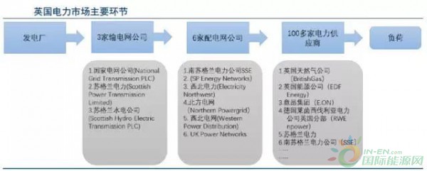 整個英國由3家輸電網(wǎng)公司負(fù)責(zé)區(qū)域性輸電網(wǎng)絡(luò)。在配電網(wǎng)層面,英國被劃分為14個區(qū)域并由6大配電網(wǎng)公司(DNOs)運(yùn)營。配電公司作為獨(dú)立于輸電和售電環(huán)節(jié)的中間人,通過運(yùn)作其擁有的配電網(wǎng)絡(luò)將輸電網(wǎng)傳輸?shù)碾娏Ψ峙浣o民用和工商業(yè)用戶。但是配電公司并不參與售電的環(huán)節(jié)。與發(fā)電、輸電和配電公司不同的是,英國電力供應(yīng)商被定義為支付配電網(wǎng)絡(luò)費(fèi)用并從電力批發(fā)市場中購買電力,再以一定價格出售給自己顧客的商業(yè)實(shí)體。