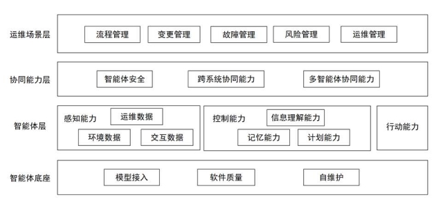 該架構(gòu)以?場(chǎng)景需求為牽引??,通過協(xié)同層打通系統(tǒng)壁壘,以智能體層的感知-決策-行動(dòng)閉環(huán)為核心能力載體,最終由底座提供工程化支撐。四層能力環(huán)環(huán)相扣,既明確了技術(shù)能力邊界,又強(qiáng)調(diào)實(shí)際落地場(chǎng)景的適配性,為企業(yè)構(gòu)建智能運(yùn)維體系提供清晰的模塊化建設(shè)路徑。