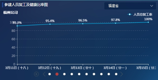 據(jù)了解,目前該應(yīng)用已上線了綜合展示、統(tǒng)計(jì)分析、項(xiàng)目管理、報(bào)表查詢4個(gè)重點(diǎn)功能。一是綜合展示,分別以地圖、熱圖、柱狀圖、曲線圖等不同方式,可直觀對(duì)比展示福建省各地區(qū)項(xiàng)目開復(fù)工生態(tài)指數(shù)及恢復(fù)趨勢(shì)等8個(gè)指標(biāo);二是統(tǒng)計(jì)分析,可展示出不同維度下各地區(qū)、各部人員復(fù)工率的恢復(fù)程度以及健康情況的統(tǒng)計(jì)視圖;三是項(xiàng)目管理,可查詢到全省各地市的具體項(xiàng)目復(fù)工復(fù)產(chǎn)情況,進(jìn)而實(shí)現(xiàn)對(duì)每個(gè)項(xiàng)目部的精準(zhǔn)分析;四是報(bào)表查詢,內(nèi)含項(xiàng)目詳細(xì)信息、人員詳細(xì)信息、人員健康情況等詳細(xì)信息,便于及時(shí)掌握人員、項(xiàng)目動(dòng)態(tài)。