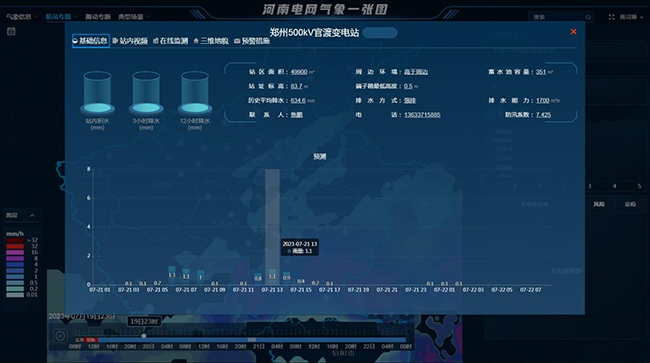 “一張圖”建設以電網(wǎng)氣象災害風險預報預警模型為核心,集夏季防汛、冬季覆冰舞動、春秋季風災等多種電網(wǎng)氣象災害風險預報預警于一體,預警信息的地理精度可具體到變電站、線路桿塔。通過平臺可實時捕捉電網(wǎng)設備的氣象要素監(jiān)測和預報信息,以及變電站周邊環(huán)境監(jiān)控等。當出現(xiàn)重大天氣過程時,平臺根據(jù)不同風險等級預測,動態(tài)提供“一站一策式”的24小時、72小時內(nèi)應對措施建議。