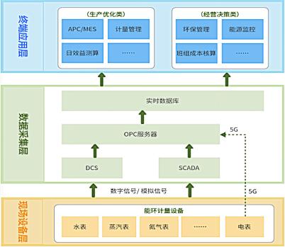 該體系主要由現(xiàn)場設(shè)備層、數(shù)據(jù)采集層、終端應(yīng)用層等組成。他們根據(jù)工藝與計(jì)量要求,先后配備了帶信號(hào)遠(yuǎn)傳功能、高準(zhǔn)確度等級(jí)的質(zhì)量流量計(jì)、電磁流量計(jì)、超聲波流量計(jì)等智能型計(jì)量儀表,實(shí)現(xiàn)一、二級(jí)能源計(jì)量表配備率達(dá)100%。通過計(jì)量儀表傳輸端采集能源計(jì)量數(shù)據(jù),上傳至DCS或SCADA系統(tǒng),再通過OPC接口上傳至實(shí)時(shí)數(shù)據(jù)庫,采用5G無線傳輸技術(shù)解決偏遠(yuǎn)區(qū)域計(jì)量儀表信號(hào)的數(shù)據(jù)采集與傳輸,最終為終端系統(tǒng)提供有效數(shù)據(jù)支持。