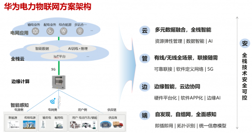 華為構(gòu)建了“云管邊端”的電力物聯(lián)網(wǎng)方案架構(gòu),并且由端到云全棧技術(shù)安全可控?!霸啤庇蒊oT平臺、智能數(shù)據(jù)和AI共同構(gòu)建數(shù)字化底座,并支撐電網(wǎng)業(yè)務(wù)云化應(yīng)用;“管”提供可靠聯(lián)接,有線/無線全場景隨需靈活聯(lián)接;“邊”具備邊緣計算、云邊協(xié)同和AI能力;“端”全面感知電網(wǎng)信息,支持自描述、自發(fā)現(xiàn)和即插即用。