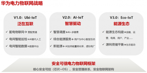 華為中國企業(yè)解決方案CTO董偉嗣表示:“電力物聯(lián)網(wǎng)是電網(wǎng)數(shù)字化轉(zhuǎn)型的引擎,其業(yè)務(wù)實質(zhì)是實現(xiàn)電網(wǎng)數(shù)字化、運營數(shù)字化和以客戶為中心的綜合能源服務(wù),并推動能源生態(tài)的轉(zhuǎn)變、優(yōu)化源網(wǎng)荷儲平衡。華為電力物聯(lián)網(wǎng)戰(zhàn)略目標是:打造安全可信電力物聯(lián)網(wǎng)框架,并結(jié)合電力業(yè)務(wù)場景,以泛在互聯(lián)Ubi-IoT、智慧驅(qū)動AI-IoT和能源生態(tài)Eco-IoT三個階段進行發(fā)展演進。