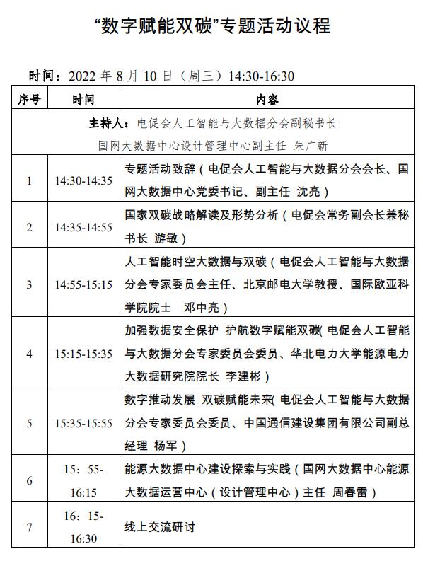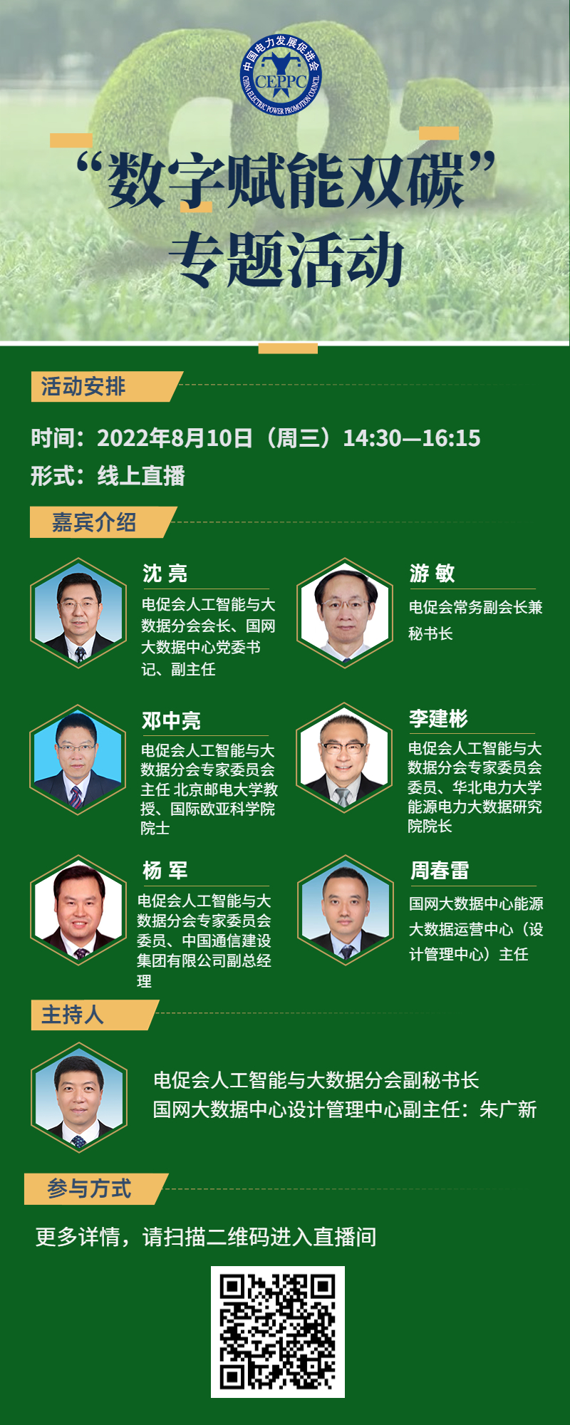 8月10日下午2點半,數(shù)字賦能雙碳線上沙龍直播,中國電力發(fā)展促進會大數(shù)據與人工智能分會邀您參加!國網大數(shù)據中心領導、電促會領導、歐亞科學院院士北京郵電大學教授、華北電力大學教授、中國通信建設集團領導等嘉賓將分享數(shù)字技術和數(shù)據如何服務雙碳目標實現(xiàn)。