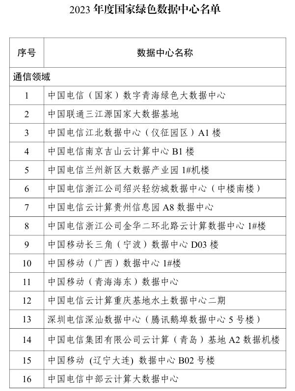 2024年第12號按照《工業(yè)和信息化部辦公廳 國家發(fā)展改革委辦公廳 商務部辦公廳 國管局辦公室 金融監(jiān)管總局辦公廳 國家能源局綜合司關(guān)于組織開展2023年度國家綠色數(shù)據(jù)中心推薦工作的通知》(工信廳聯(lián)節(jié)函﹝2023﹞341號)要求,經(jīng)地方推薦、專家評審、社會公示等程序,現(xiàn)將2023年度50家國家綠色數(shù)據(jù)中心名單予以公告。