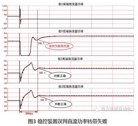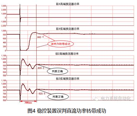 直流故障前后總損失的功率是穩(wěn)控系統(tǒng)執(zhí)行控制策略的重要依據(jù)。直流故障暫態(tài)過程復(fù)雜,若由穩(wěn)控裝置計算事故前功率與事故后的穩(wěn)態(tài)功率差,事故前后的時間窗口Δt難以確定。實踐表明:Δt過短(最初設(shè)計為30ms),可能會誤判健全換流器的轉(zhuǎn)帶;而延長Δt,即便是增加至300ms,在某些運行工況下,仍然會出現(xiàn)誤判為轉(zhuǎn)帶失敗(如圖3)或誤判為轉(zhuǎn)帶成功(如圖4)的情況。經(jīng)過大量實驗數(shù)據(jù)分析,若要確保在所有故障工況下裝置均不會誤判,則Δt至少需延長至500ms以上,無法滿足電網(wǎng)的穩(wěn)定控制需求。