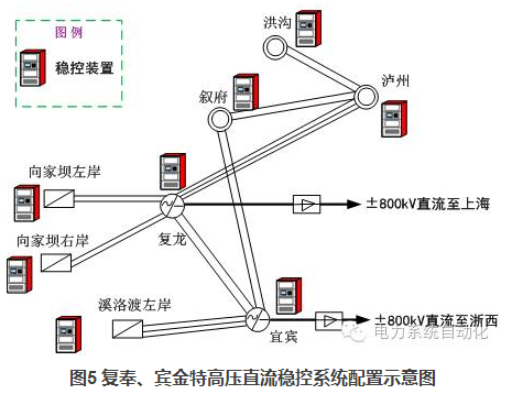 隨著多個特高壓交直流輸電通道的建成投產(chǎn),控制策略的設(shè)計和制定面臨新的要求,尤其體現(xiàn)在多個穩(wěn)控系統(tǒng)和控制策略間的協(xié)調(diào)控制方面。以復(fù)奉直流、賓金直流為例,為了解決兩大特高壓直流送出的穩(wěn)定問題,在復(fù)龍換流站、宜賓換流站、溪洛渡電廠等8個廠站配置了安全穩(wěn)定控制裝置,如圖5所示。經(jīng)計算,兩大直流故障后均可能會切除向左、向右以及溪左三個電廠的機組,兩個穩(wěn)控系統(tǒng)之間的控制措施有重疊。若按傳統(tǒng)的思路制定策略和實施方案,兩套穩(wěn)控系統(tǒng)間無信息交互和協(xié)調(diào),當(dāng)出現(xiàn)兩大直流同時雙極閉鎖的極端故障時,某些機組會同時被兩個主站發(fā)來的命令切除,從而導(dǎo)致控制措施量不足。