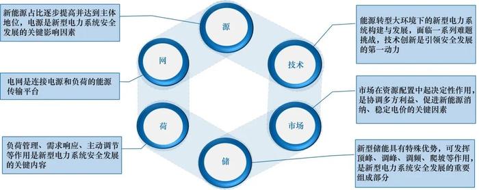 新型電力系統(tǒng)是實現“雙碳”目標、重塑能源安全格局的重要載體,構建新型電力系統(tǒng)是提高能源安全韌性的根本性舉措。新型電力系統(tǒng)的安全發(fā)展主要受到源、網、荷、儲、市場、技術六大因素的綜合影響(見圖1)。