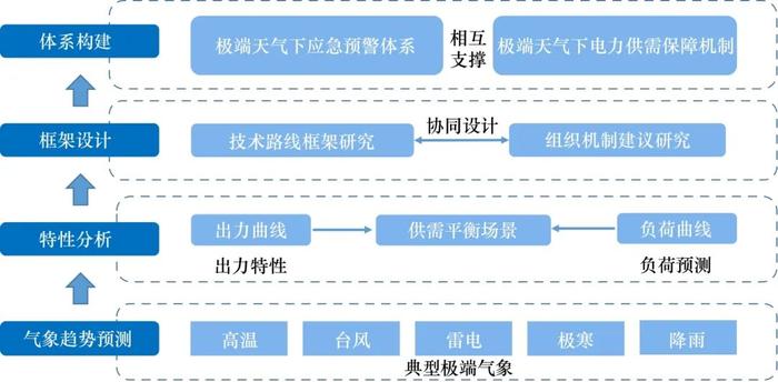 在供需結(jié)構(gòu)方面,基于極端氣象特征、氣象發(fā)展趨勢研究成果,分析極端天氣下新能源波動、負(fù)荷可調(diào)節(jié)的電力供需平衡場景,攻關(guān)電力供需保障技術(shù),構(gòu)建電力系統(tǒng)應(yīng)急組織機制,提出電力系統(tǒng)在極端天氣下的應(yīng)急預(yù)警體系。