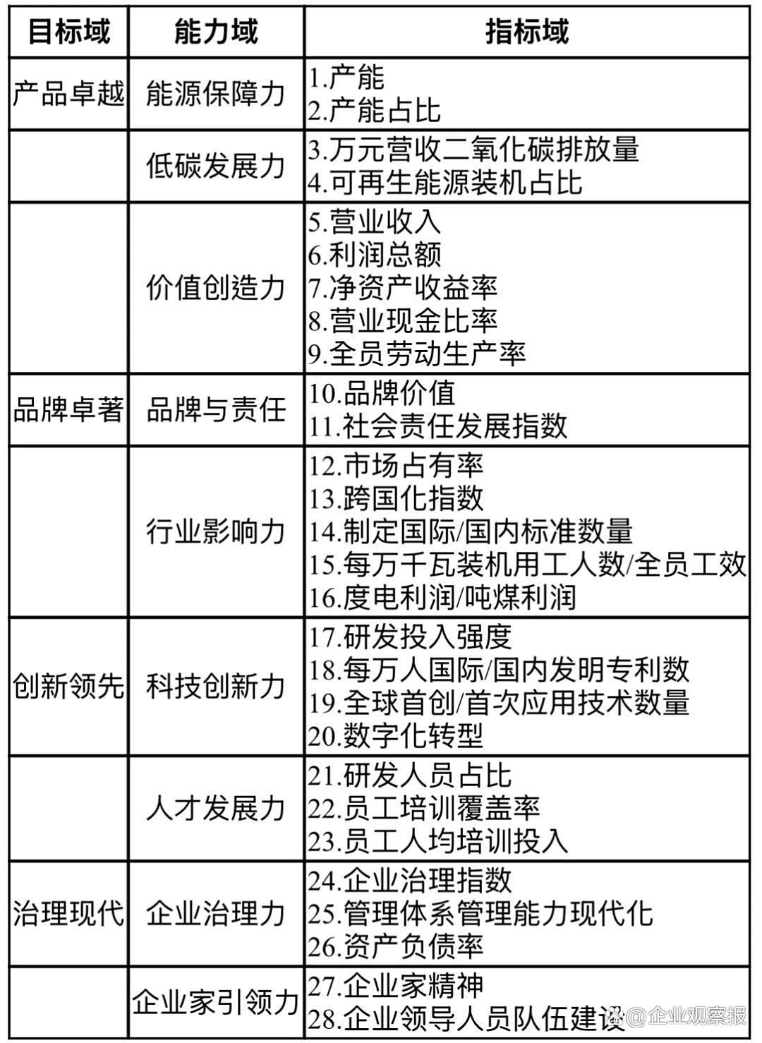 在構(gòu)建了目標(biāo)域與能力域的關(guān)系基礎(chǔ)上,以產(chǎn)品卓越、品牌卓著、創(chuàng)新領(lǐng)先、治理現(xiàn)代為目標(biāo),由每項關(guān)鍵能力延伸出具體指標(biāo),從而形成三級結(jié)構(gòu)的世界一流能源電力企業(yè)對標(biāo)指標(biāo)體系,見表1。指標(biāo)體系共包含28項具體指標(biāo):第一級包含4個維度,分別是產(chǎn)品卓越、品牌卓著、創(chuàng)新領(lǐng)先、治理現(xiàn)代;第二級是以第一級指標(biāo)為目標(biāo)、結(jié)合能源電力企業(yè)經(jīng)營發(fā)展的特征及趨勢而確定的8項關(guān)鍵成功要素,分別是產(chǎn)品保障力、價值創(chuàng)造力、品牌與責(zé)任、行業(yè)影響力、科技創(chuàng)新力、商業(yè)創(chuàng)新力、治理力以及企業(yè)家引領(lǐng)力;第三級是第二級指標(biāo)延伸的28項指標(biāo),涵蓋了國務(wù)院國資委關(guān)于世界一流企業(yè)的評價指標(biāo)和中央企業(yè)的年度考核指標(biāo),反映了企業(yè)包含科技創(chuàng)新、行業(yè)引領(lǐng)和社會責(zé)任等方面的綜合實力和水平。