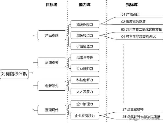 “一個體系”,即構(gòu)建業(yè)績維度和管理要素并重的,滿足全集團(tuán)統(tǒng)一、多級貫通的世界一流企業(yè)對標(biāo)指標(biāo)體系。對標(biāo)指標(biāo)體系重點(diǎn)體現(xiàn)“產(chǎn)品卓越、品牌卓著、創(chuàng)新領(lǐng)先、治理現(xiàn)代”十六字標(biāo)準(zhǔn)和“創(chuàng)新力、競爭力、治理力、影響力、引領(lǐng)力”五力要求,結(jié)合集團(tuán)未來發(fā)展方向、定位和目標(biāo)等進(jìn)行選擇和設(shè)置,通過分級分類建立集團(tuán)各級子公司的對標(biāo)指標(biāo)體系,形成涵蓋集團(tuán)公司綜合對比指標(biāo)體系及子分公司等若干產(chǎn)業(yè)特色共性指標(biāo),實現(xiàn)傳導(dǎo)壓力、激發(fā)動力,進(jìn)而增強(qiáng)創(chuàng)建世界一流企業(yè)行動的系統(tǒng)性、針對性和有效性。