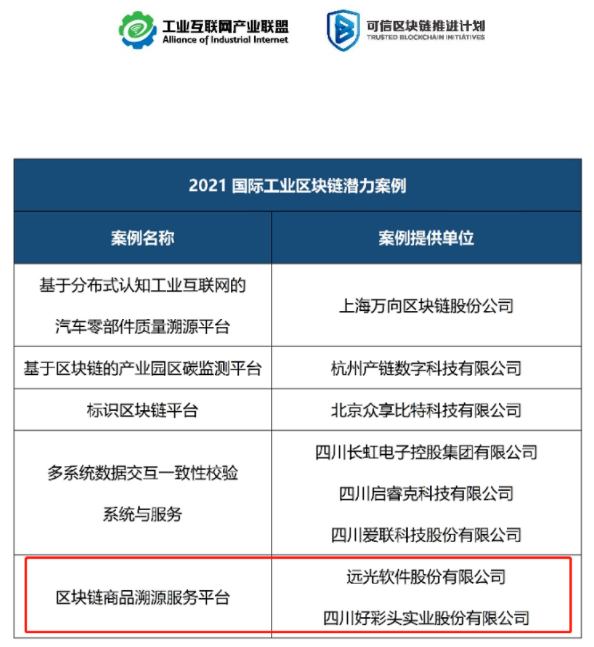近日,由湖南省工業(yè)和信息化廳主辦的2021國際工業(yè)區(qū)塊鏈大會在長沙順利召開,會上發(fā)布了《2021工業(yè)區(qū)塊鏈案例集》、《工業(yè)區(qū)塊鏈應(yīng)用指南》、《2021工業(yè)區(qū)塊鏈技術(shù)應(yīng)用及趨勢報告》等重磅成果。憑借在區(qū)塊鏈領(lǐng)域的創(chuàng)新技術(shù)能力及應(yīng)用成果,遠(yuǎn)光軟件區(qū)塊鏈商品溯源服務(wù)平臺成功入選《2021工業(yè)區(qū)塊鏈案例集》。