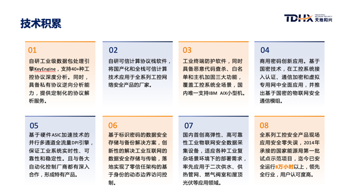 本次活動(dòng)中,副總裁楊小帥更近一步向大家介紹了天地和興深厚的技術(shù)積累:自研工業(yè)級(jí)數(shù)據(jù)包處理引擎KeyEngine,支持40+種工控協(xié)議深度分析;自研可信計(jì)算協(xié)議棧軟件,是將國(guó)產(chǎn)化和全棧可信計(jì)算技術(shù)應(yīng)用于全系列工控網(wǎng)絡(luò)安全產(chǎn)品的廠商;工業(yè)終端防護(hù)軟件,覆蓋工控系統(tǒng)全場(chǎng)景,還是國(guó)內(nèi)唯一支持IBM AIX小型機(jī);商用密碼創(chuàng)新應(yīng)用,并推出基于國(guó)密的物聯(lián)網(wǎng)安全通信模組;基于硬件ASIC加速技術(shù)的并行多通道全流量DPI引擎,保證工業(yè)系統(tǒng)實(shí)時(shí)性、可靠性和穩(wěn)定性;基于標(biāo)識(shí)密碼的數(shù)據(jù)安全存儲(chǔ)與備份解決方案,創(chuàng)新性的解決工業(yè)互聯(lián)網(wǎng)的數(shù)據(jù)安全存儲(chǔ)與傳輸;國(guó)內(nèi)首創(chuàng)高彈性、高可靠性工業(yè)物聯(lián)網(wǎng)安全數(shù)據(jù)采集設(shè)備,適應(yīng)各種工業(yè)復(fù)雜場(chǎng)景環(huán)境下的部署需求;全系列工控安全產(chǎn)品現(xiàn)場(chǎng)應(yīng)用安全零失誤,2014年承接的國(guó)家能源局第一批試點(diǎn)示范項(xiàng)目,迄今已安全運(yùn)行8萬(wàn)小時(shí)以上。