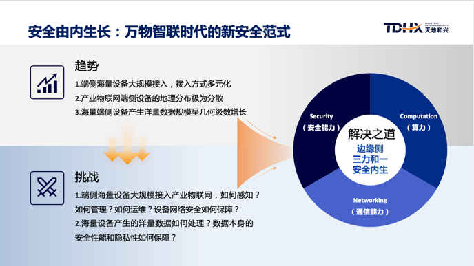 工業(yè)和信息化部研究機(jī)構(gòu)數(shù)據(jù)顯示:我國(guó)工業(yè)互聯(lián)網(wǎng)產(chǎn)業(yè)規(guī)模目前已邁過(guò)了“萬(wàn)億”大關(guān),并進(jìn)一步刺激了數(shù)字經(jīng)濟(jì)在工業(yè)領(lǐng)域的廣泛應(yīng)用,工業(yè)制造的數(shù)字化和網(wǎng)絡(luò)化催生出巨大的網(wǎng)絡(luò)安全需求。天地和興CTO李凱斌介紹:數(shù)字經(jīng)濟(jì)大背景下,萬(wàn)物智聯(lián)時(shí)代將面臨新安全挑戰(zhàn),即:1、端側(cè)海量設(shè)備大規(guī)模接入產(chǎn)業(yè)物聯(lián)網(wǎng),如何感知?如何管理?如何運(yùn)維?設(shè)備網(wǎng)絡(luò)安全如何保障?2、海量設(shè)備產(chǎn)生的洋量數(shù)據(jù)如何處理?數(shù)據(jù)本身的安全性能和隱私性如何保障?而解決之道在于“三力合一”:安全能力、算力、通信能力,三者合一。安全,由內(nèi)生長(zhǎng)。