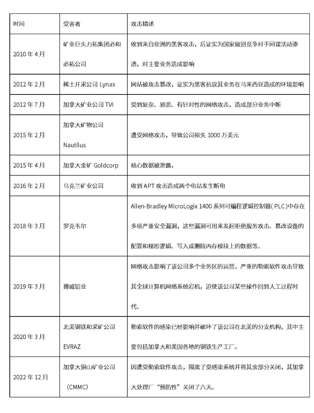 但隨著原有封閉的礦山工業(yè)控制系統(tǒng)與開放的信息化系統(tǒng)融合,也帶來了大量的網(wǎng)絡(luò)安全威脅。而大型礦山企業(yè)工業(yè)網(wǎng)絡(luò)復(fù)雜,存在較多的管理薄弱環(huán)節(jié),更容易受到來自外部的惡意攻擊或內(nèi)部操作失誤所引起的網(wǎng)絡(luò)異常,由此造成停產(chǎn)和監(jiān)管部門處罰將會(huì)給企業(yè)造成大量損失。從國際上來看,有下列較為嚴(yán)重的網(wǎng)絡(luò)攻擊案例: