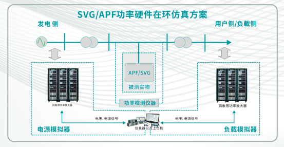 在電力系統(tǒng)應(yīng)用場景中,PAS放大器與仿真器的結(jié)合,能夠?qū)Πl(fā)電側(cè)和負載側(cè)進行數(shù)字化模擬,結(jié)合功率檢測儀的實測數(shù)據(jù),通過數(shù)據(jù)采集系統(tǒng),可實現(xiàn)以APF,SVG為被測設(shè)備的半實物功率硬件在環(huán)仿真測試。