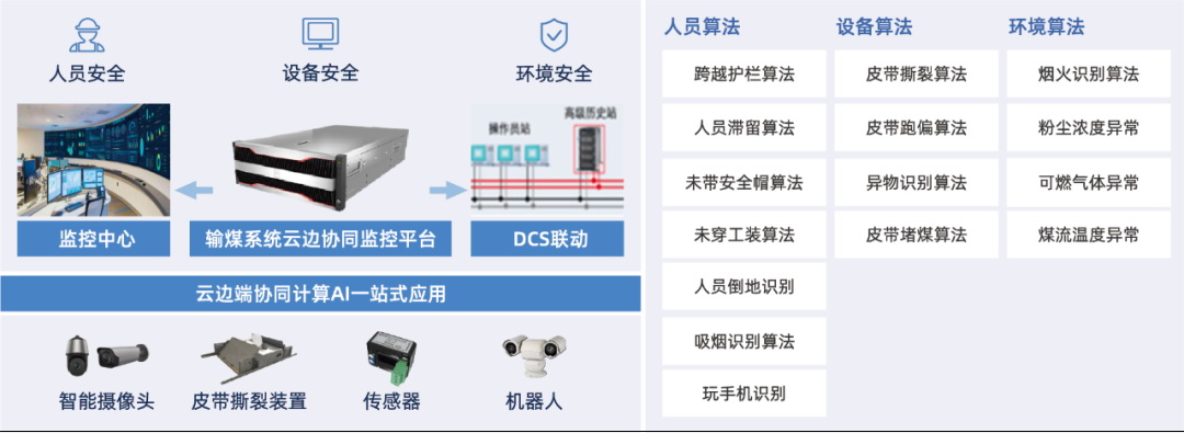 方案通過云邊端協(xié)同架構把智能采集裝置、皮帶撕裂識別裝置、環(huán)境傳感器等進行數據的統(tǒng)一匯聚分析,對異常情況進行識別和報警,并通過DCS系統(tǒng)控制聯(lián)動,提高人員、設備、環(huán)境的安全管理水平。 在設備故障監(jiān)測方面,可對皮帶異物、落煤口堵煤、皮帶跑偏、運行環(huán)境火花等情況進行識別,避免異物運輸對皮帶造成意外損傷或引發(fā)事故;在人員安全管控方面,設置吸煙、安全帽佩戴、翻越護欄、人員倒地等相關算法,對巡檢人員的不安全行為進行識別管控;在環(huán)境監(jiān)控方面,通過安裝布設有毒有害氣體監(jiān)測傳感器、溫度傳感器、粉塵監(jiān)測傳感器等對輸煤環(huán)境進行在線實時監(jiān)測,及時發(fā)現(xiàn)高溫、有毒有害氣體超標、粉塵濃度超標并預警,最大程度保障人員操作環(huán)境安全。