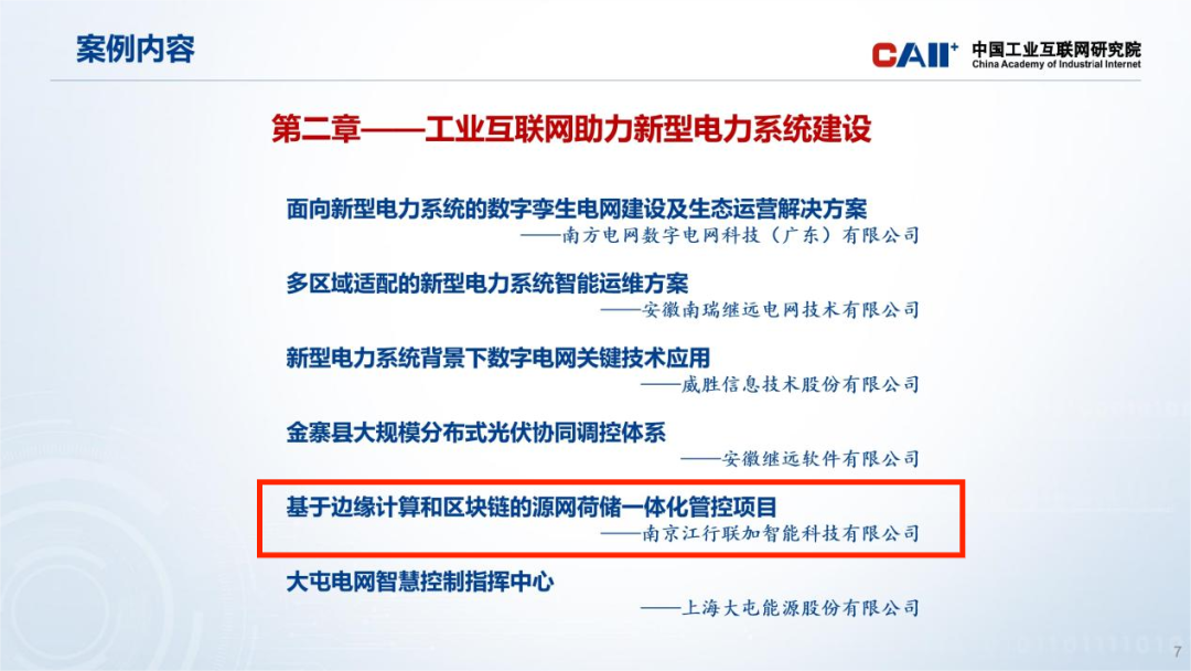 江行智能“基于邊緣計(jì)算和區(qū)塊鏈的源網(wǎng)荷儲(chǔ)一體化管控項(xiàng)目”從近百份能源工業(yè)互聯(lián)網(wǎng)相關(guān)案例中脫穎而出,作為新型電力系統(tǒng)建設(shè)的典型案例入選。