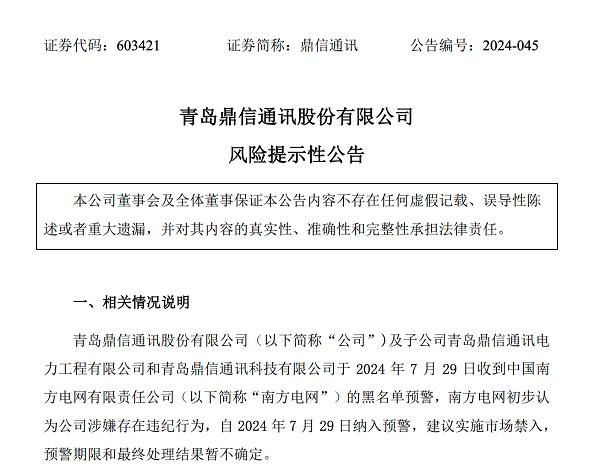 7月30日,鼎信通訊(603421.SH)提示風(fēng)險,公司及子公司于7月29日收到中國南方電網(wǎng)有限責(zé)任公司(以下簡稱“南方電網(wǎng)”)的黑名單預(yù)警,南方電網(wǎng)初步認為公司涉嫌存在違紀(jì)行為,自2024年7月29日納入預(yù)警,建議實施市場禁入,預(yù)警期限和最終處理結(jié)果暫不確定。