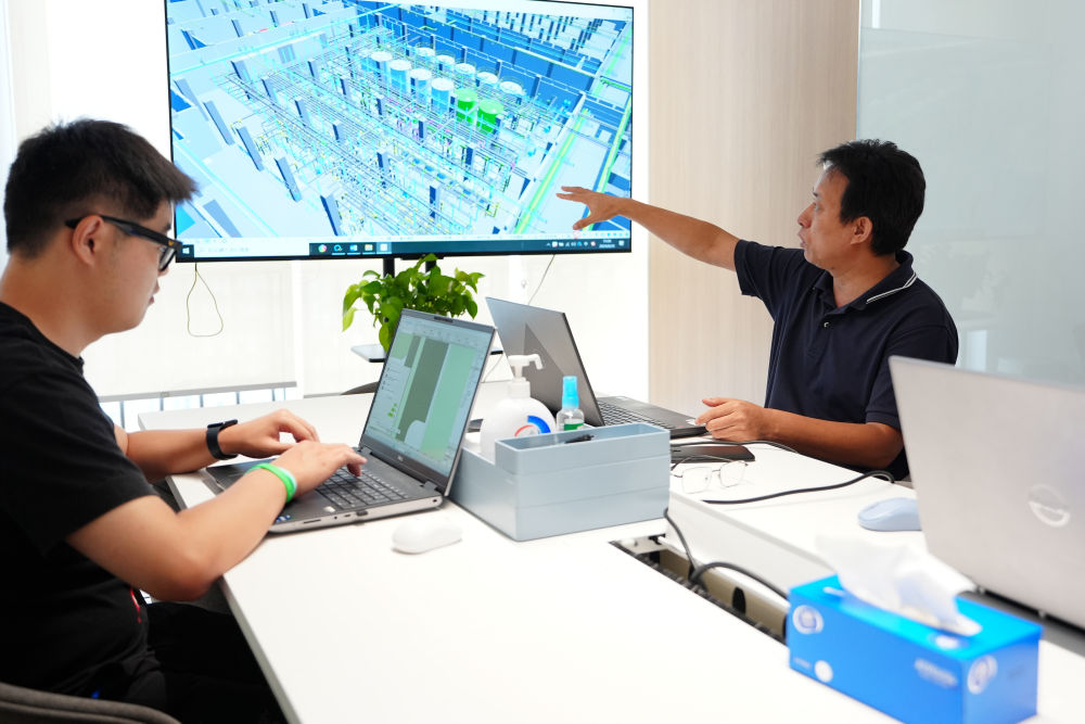 2024年8月26日,中國(guó)電子院工作人員利用數(shù)字孿生模型討論某半導(dǎo)體項(xiàng)目純水系統(tǒng)方案