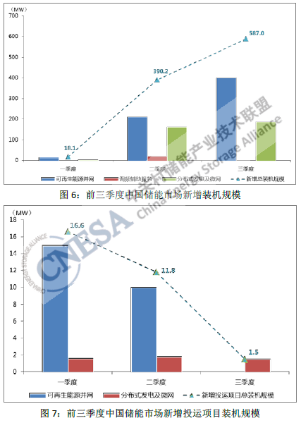 據中關村儲能產業(yè)技術聯盟(CNESA)項目庫的不完全統計,2016年三季度,中國新增儲能項目(含投運、在建、規(guī)劃中項目)14個,裝機規(guī)模587.0MW,同比增長586%,環(huán)比今年二季度增長了50%。三季度新增項目主要分布在可再生能源并網和分布式發(fā)電及微網領域。