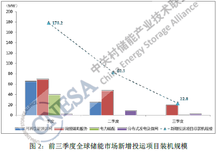 2016年三季度,全球新增投運儲能項目11個,裝機規(guī)模22.8MW,同比下降23%,環(huán)比今年二季度下降了72%。三季度新增投運項目主要分布在調頻輔助服務領域,儲能在該領域中的裝機占比接近90%。