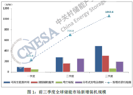 據中關村儲能產業(yè)技術聯盟(CNESA)項目庫的不完全統計,2016年三季度,全球新增儲能項目(含投運、在建、規(guī)劃中項目)54個,裝機規(guī)模共計1063.6MW,同比增長780%,環(huán)比今年二季度增長了51%。三季度新增項目主要分布在可再生能源并網和調頻輔助服務領域,儲能在這兩個領域中的裝機占比分別為46%和29%。