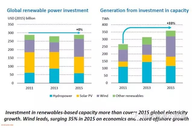 特別值得一提的是,2011年以來全球在可再生能源發(fā)電投資基本平穩(wěn),但是由于可再生能源成本的下降,每年新增的可再生能源發(fā)電量逐年增加,2015年超出2011年33%。此外,電力儲能投資2015年超過100億美元,是2010年的10倍;但是儲能投資僅占電網投資的0.4%,還有很長的路要走。