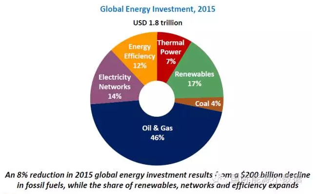 雖說油氣投資大幅下降,但是在全球1.83萬億的能源投資總額中,油氣投資占比達到46%。可再生能源投資占17%;火電發(fā)電廠投資占7%,電力輸配網投資占14%;能效投資占12%;煤炭開采和運輸投資僅占4%。