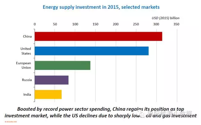 2015年中國能源領域總投資為3150億美元,占全球能源總投資的17%,是世界上第一能源投資大國,遠超位居第二的美國(2800億美元)。在中國能源投資中,有900億美元用于可再生能源發(fā)電;450億美元用于化石能源電廠(主要是煤電廠,2015年新增煤電裝機接近45吉瓦)。
