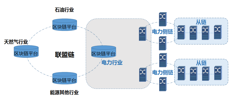 能源區(qū)塊鏈平臺以聯(lián)盟鏈架構(gòu)為基礎,采用“主、側(cè)、從”多鏈混合模式(見圖1),構(gòu)建覆蓋電力、石油、天然氣等各類能源業(yè)務應用的區(qū)塊鏈公共服務平臺,為能源行業(yè)跨地域、跨企業(yè)的多方協(xié)同與信任傳導提供支撐。