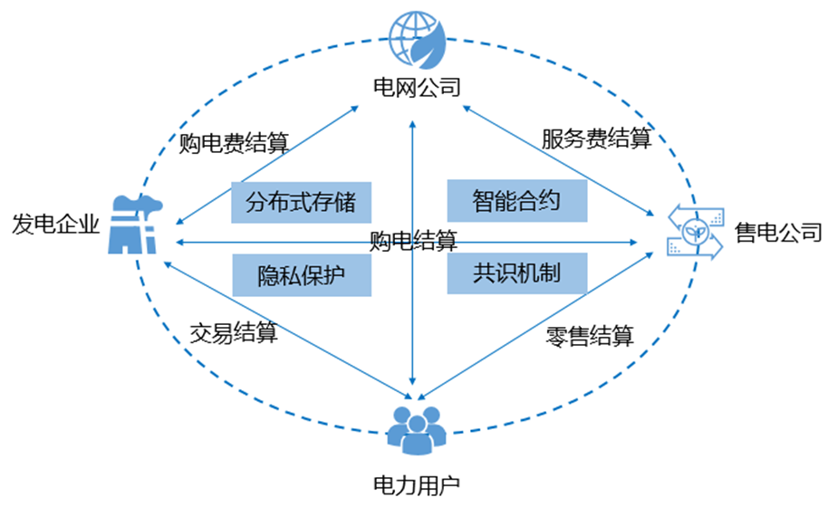 基于區(qū)塊鏈的電費結(jié)算方案,通過區(qū)塊鏈智能合約機制、分布式存儲技術(shù)將電力市場的交易主體(發(fā)電企業(yè)、售電公司、電網(wǎng)公司、電力用戶)“鏈”接起來,用數(shù)字化編碼將清算結(jié)算規(guī)則寫入?yún)^(qū)塊鏈,進一步提高相關(guān)交易的公開透明程度,使購電、零售和服務等結(jié)算過程更可信、更可控,形成以滿足用戶為代表的市場主體個性化結(jié)算服務模式。